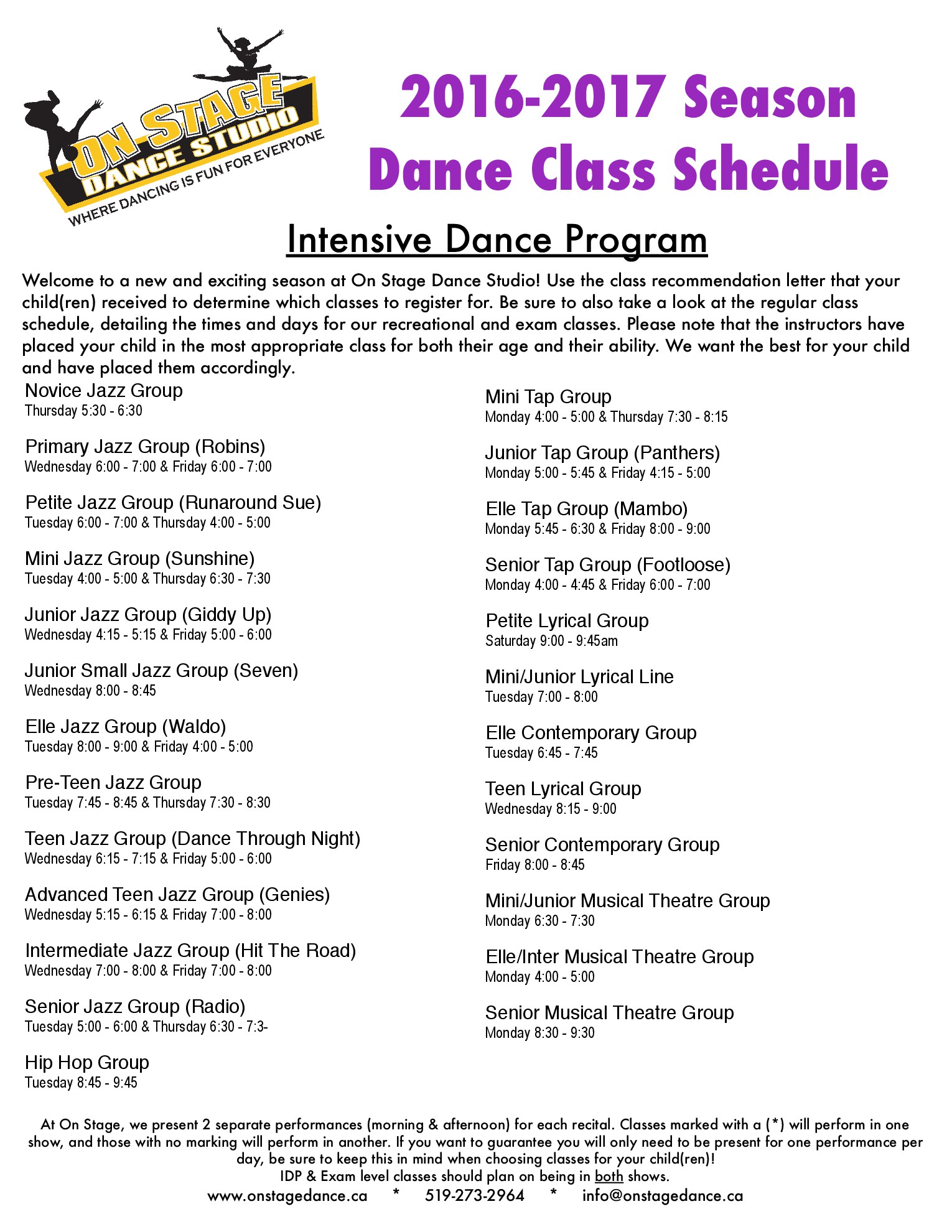 Intensive Dance Program 2016-2017 Schedule